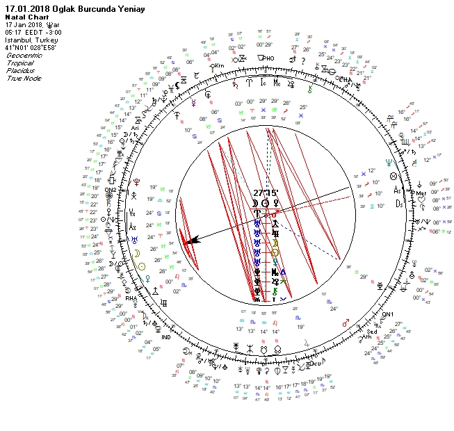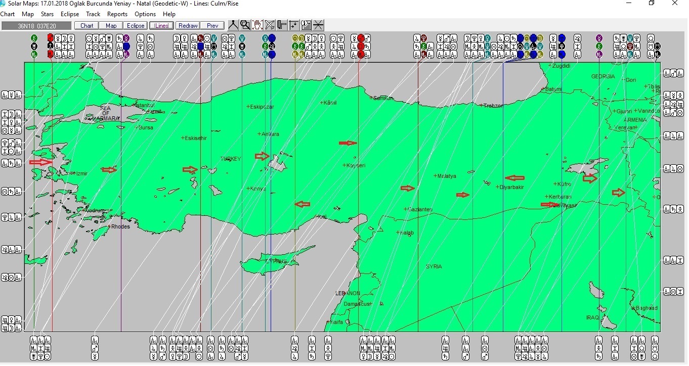 Yukarıda 17 Ocak yeniayına ait kartografik haritayı görmektesiniz. Harita üzerinde renkli oklarla işaretli hatlar ve çevresi, yeniay enerjisinden daha belirgin etkilenmesi olası yerlerdendir.
