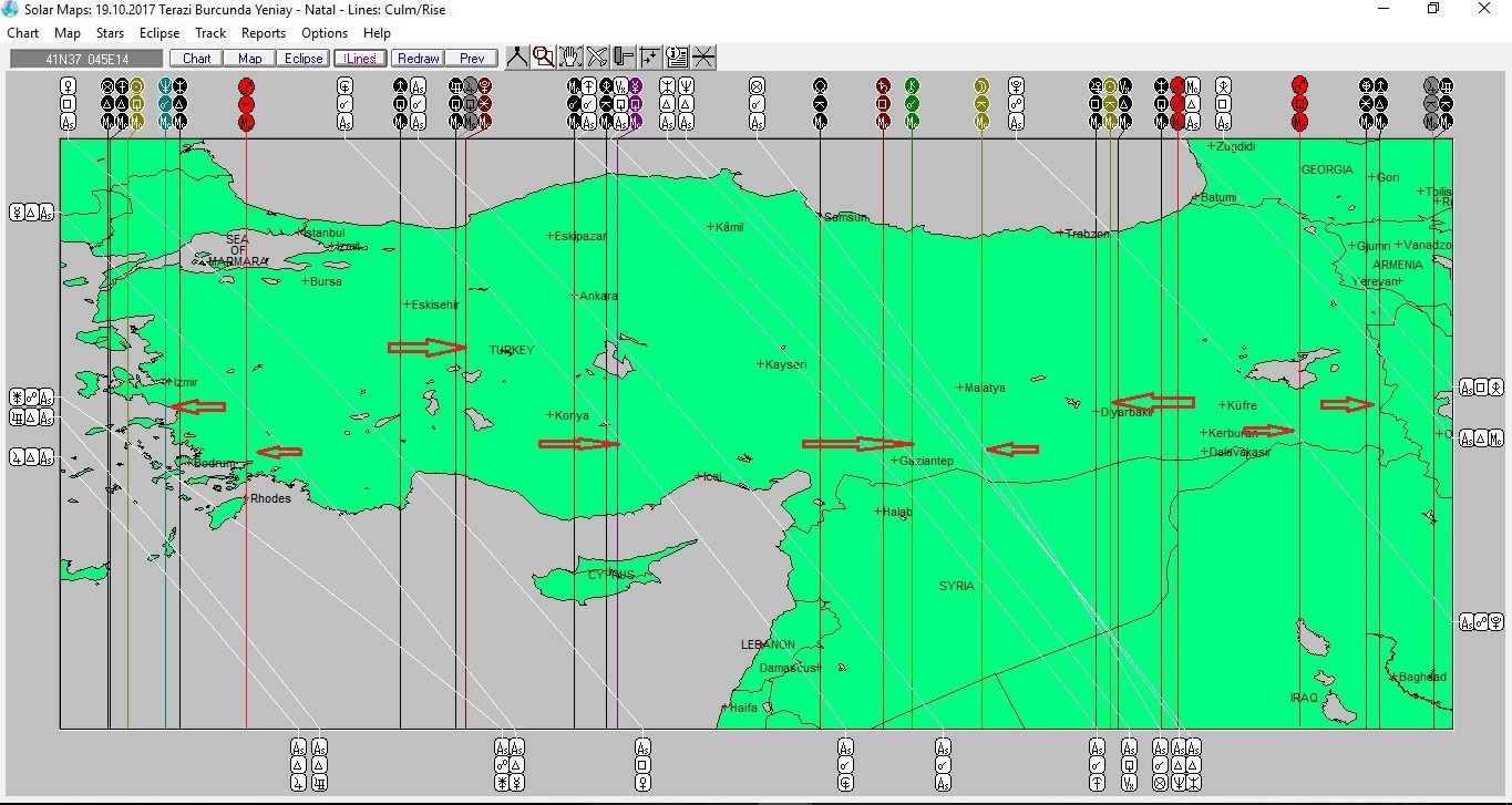 Yukarıda 19 Ekim Terazi yeniayına ait kartografik haritayı görmektesiniz . Harita üzerinde renkli oklarla işaretli hatlar ve çevresi , yeniay enerjisinden daha belirgin etkilenmesi olası yerlerdendir.