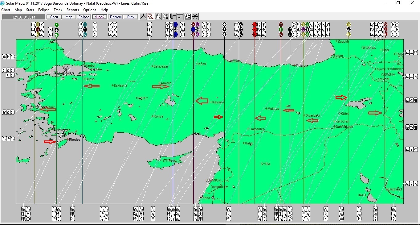 Yukarıda 4 Kasım Boğa dolunayına ait kartografik haritayı görmektesiniz. Harita üzerinde renkli oklarla işaretli hatlar ve çevresi , dolunay enerjisinden daha belirgin etkilenmesi olası yerlerdendir.