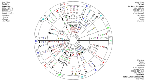 Tutulma aksı ile 1.evdeki Pluto, üstünde transit yapan Kronos ve 7.evdeki progres Merkür, üstünde transit yapan Pluto’nun oluşturduğu görünüm, hükümet ile muhalefet , halk, otorite ile harita sahibi arasında tansiyon yükselmesine sebep olabilir, dengeyi kurma konusunda zorlayabilir. Aynı şekilde isyankar etkiye sahip Uranüs de bu tutulmada Chiron ile birlikte. Yıl içinde daha sonra yapacağı retro ile 3. kere bu noktayı tetikleyerek, bizleri sürprizlerle karşı karşıya getirebilir.
