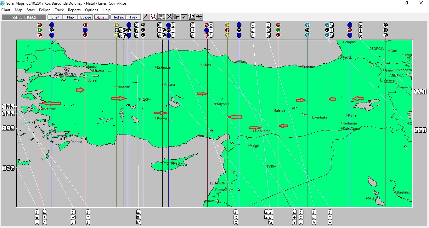 Yukarıda 5 Ekim Koç burcun dolunayına ait kartografik haritayı görmektesiniz. Harita üzerinde renkli oklarla işaretli hatlar ve çevresi, dolunay enerjisinden daha belirgin etkilenmesi olası yerlerdendir.