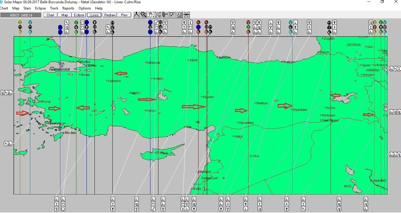 Yukarıda 6 Eylül Balık dolunayına ait kartografik haritayı görmektesiniz. Harita üzerinde renkli oklarla işaretli hatlar ve çevresi, dolunay enerjisinden daha belirgin etkilenmesi olası yerlerdendir.