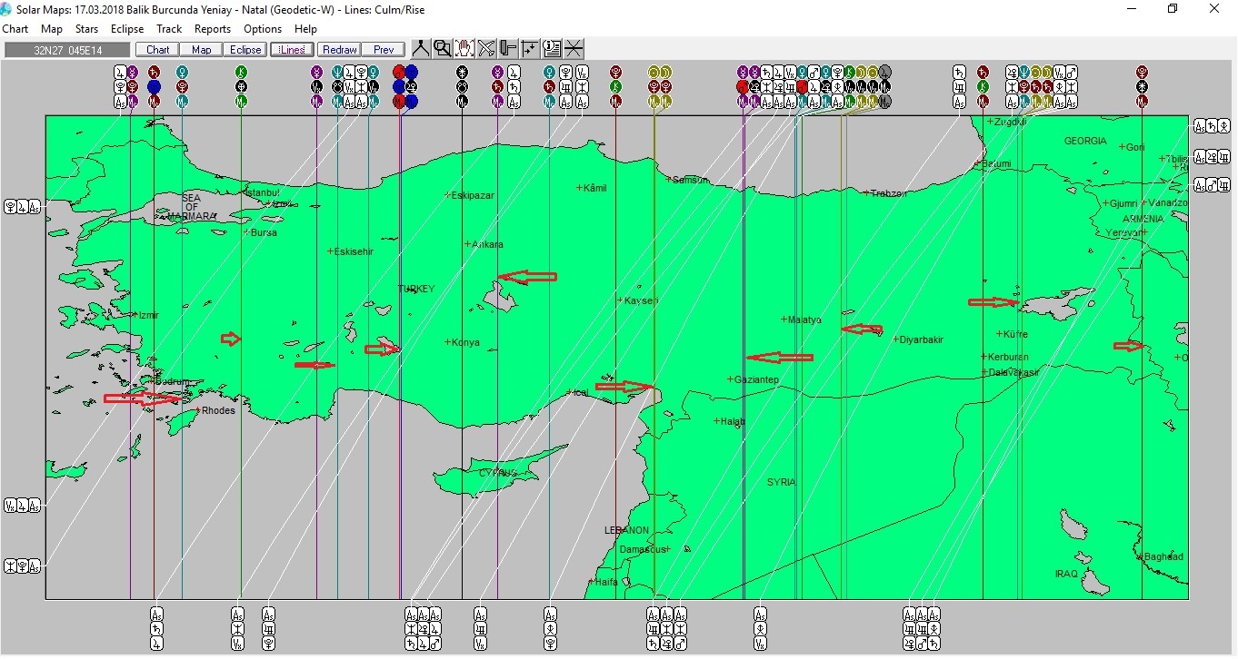 Yukarıda 17 Mart günü gerçekleşecek olan yeniaya ait ülkemizin kartografik haritasını görmektesiniz. Harita üzerinde renkli oklarla işaretli hatlar ve çevresi, yeniay enerjisinden daha belirgin etkilenmesi olası yerlerdendir.