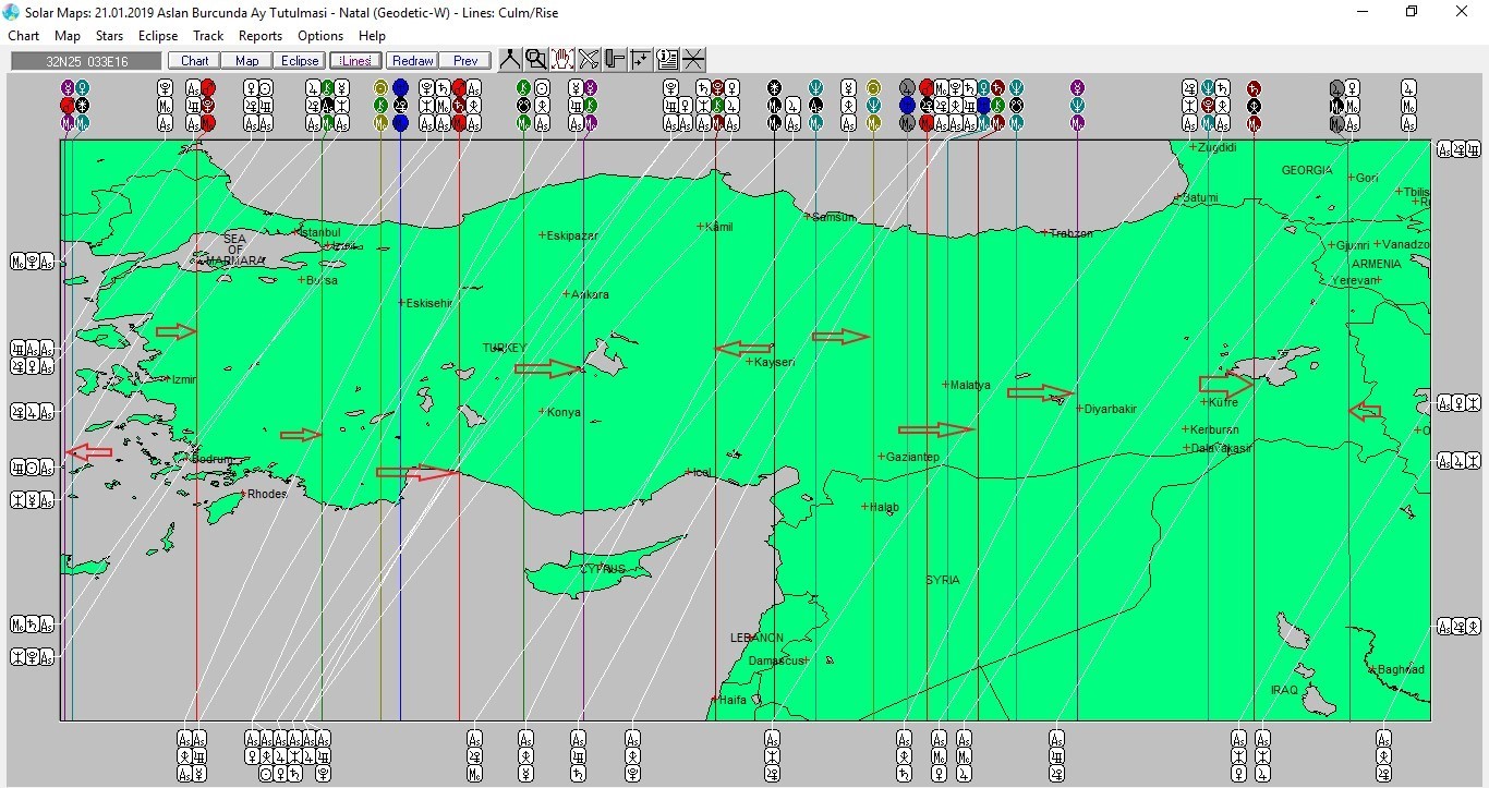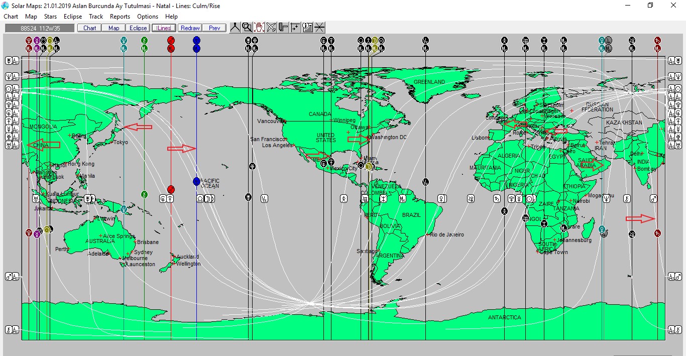 Yukarıda 21 Ocak günü Aslan burcunda meydana gelecek olan Ay tutulmasına ait ülkemizin, aşağıda ise dünya astrokartografik haritalarını görmektesiniz. Haritalar üzerinde renkli oklarla işaretli hatlar ve çevresi, tutulma enerjisinden daha belirgin etkilenmesi olası yerlerdendir.