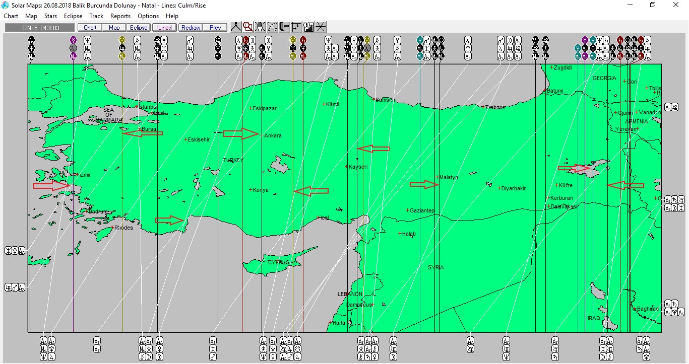 Yukarıda 26 Ağustos günü Balık burcunda meydana gelecek olan dolunaya ait ülkemizin kartografik haritasını görmektesiniz. Harita üzerinde renkli oklarla işaretli hatlar ve çevresi, dolunay enerjisinden daha belirgin etkilenmesi olası yerlerdendir.