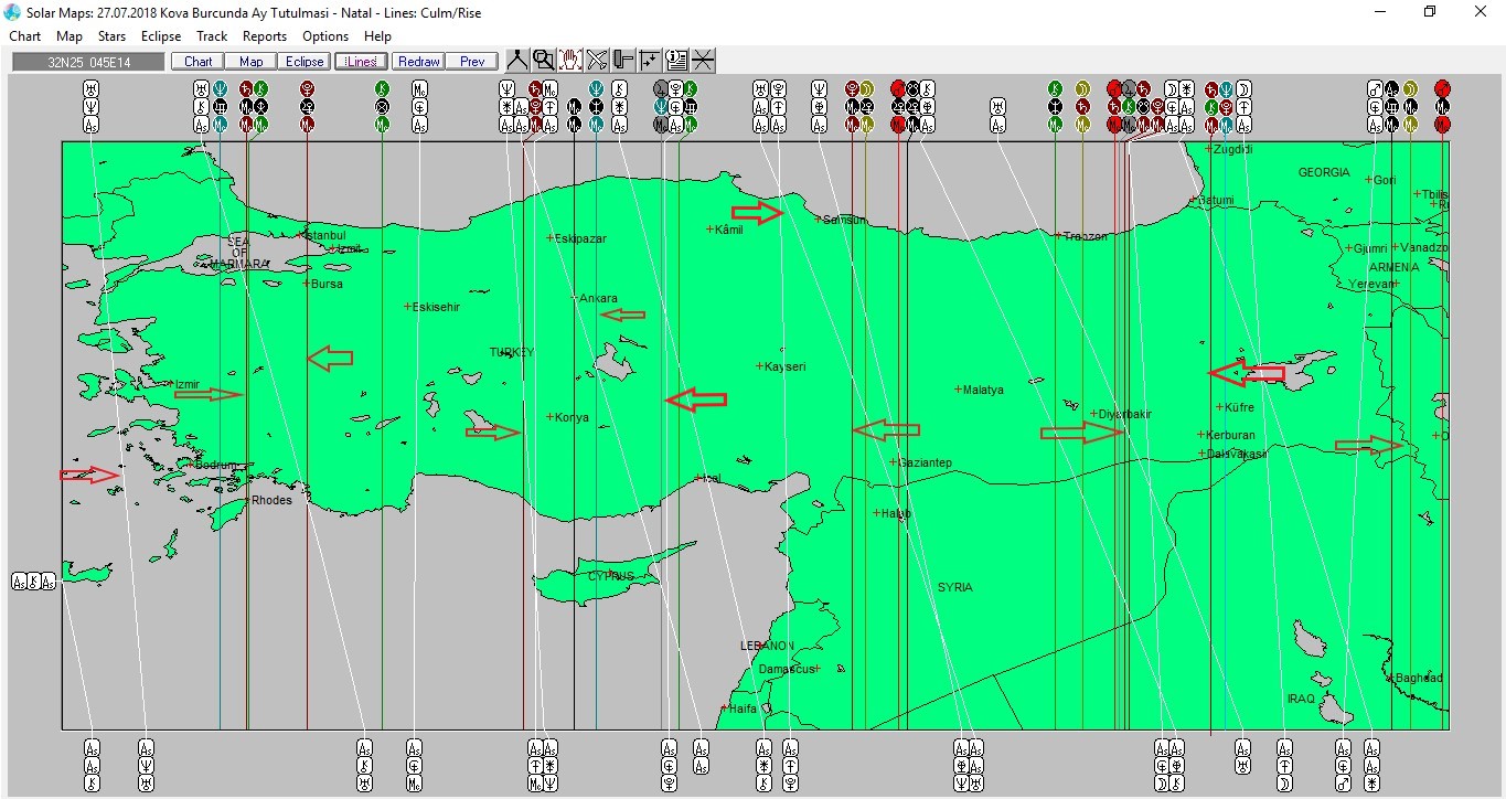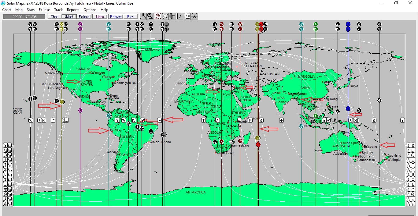 Yukarıda 27 Temmuz günü Kova burcunda meydana gelecek olan Ay tutulmasına ait ülkemizin kartografik haritasını , aşağıda ise dünyanınkini görmektesiniz. Haritalar üzerinde renkli oklarla işaretli hatlar ve çevresi, tutulma enerjisinden daha belirgin etkilenmesi olası yerlerdendir.