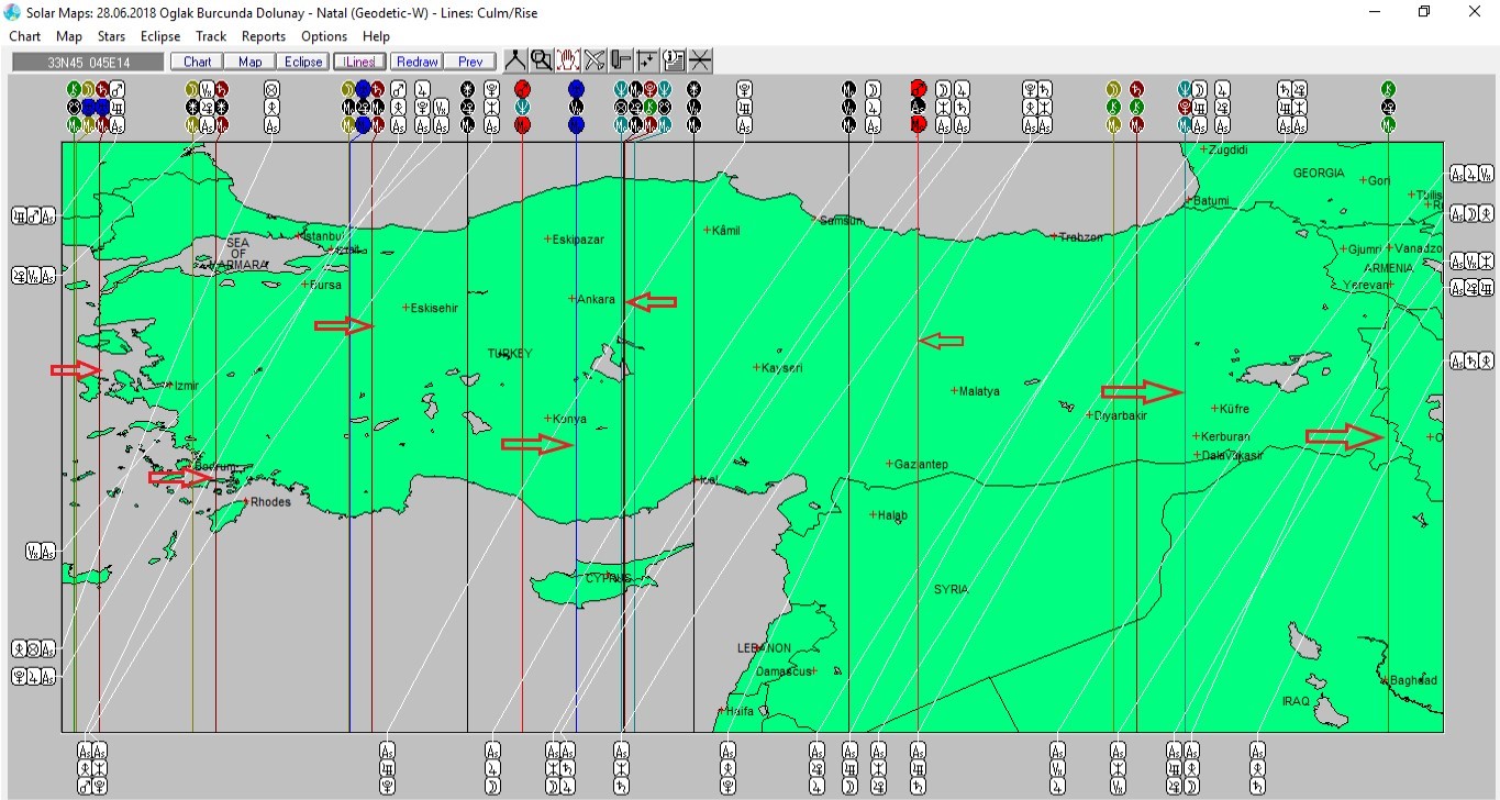 Yukarıda 28 Haziran günü Oğlak burcunda meydana gelecek olan dolunaya ait ülkemizin kartografik haritasını görmektesiniz. Harita üzerinde renkli oklarla işaretli yerler ve çevresi, dolunay enerjisinden daha belirgin etkilenmesi olası yerlerdendir.