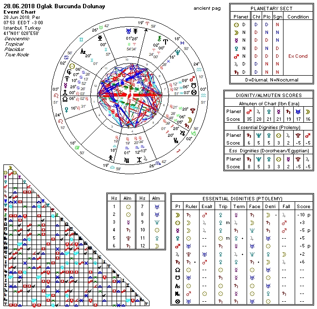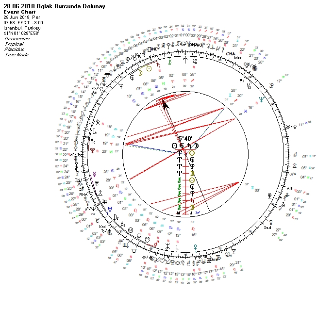Yükselende sahnede ilgi odağı olmayı, öncülük, liderlik yapmayı ve bu arada bir yandan da sırtının sıvazlanmasını seven ve gölgesinde ego, müsriflik, kibir, gösteriş besleyen Aslan burcunu görmekteyiz. Yükselen derecesine etki eden faktörlere baktığımızda aslında biraz daha geri planda tutan, içe dönmeye yönelten, zorlukların olduğu ya da belki daha önce hazırlığı yapılmış ama başkalarından gizlenen, belki de farkına varmadığımız koşulların olduğunu söyleyebilirim. Bunlar dış ya da karşı faktörlerinde etkisiyle bir anda ortaya çıkabilir, odağa oturabilir. Yükselen derecesine Talitha sabit yıldızının etkisini görmekteyiz. Eski kayıtlara göre bu yıldız otokontrollü, sessiz, şüpheci, sabırlı ama kışkırtıldığında büyük öfke kusan, kin duygusu taşıyanla eşleştirilmiş. Dolayısıyla bu etkileri de dışavurumda hissedebiliriz.