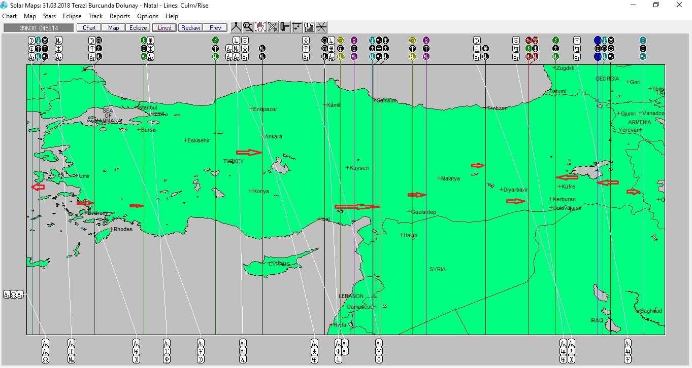 Yukarıda 31 Mart günü meydana gelecek olan dolunaya ait ülkemizin kartografik haritasını görmektesiniz. Harita üzerinde renkli oklarla işaretli hatlar ve çevresi, dolunay enerjisinden daha belirgin etkilenmesi olası yerlerdendir.