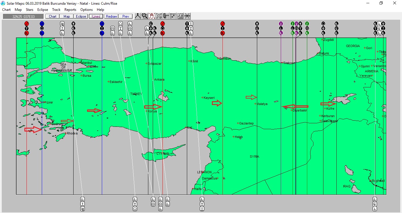 Yukarıda Balık burcunda gerçekleşecek yeniaya ait ülkemizin kartografik haritasını görmektesiniz. Harita üzerinde renkli oklarla işaretli hatlar ve çevresi, dolunay enerjisinden daha belirgin etkilenmesi olası yerlerdendir.