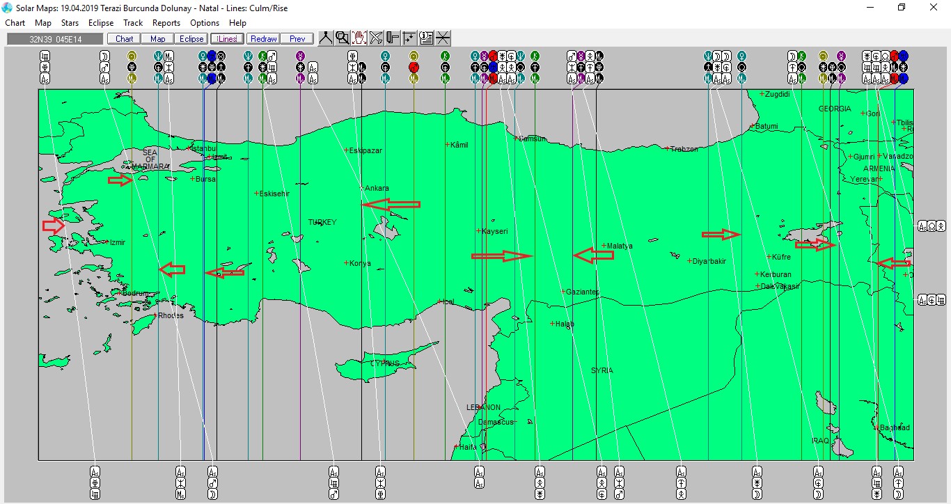 Yukarıda Terazi dolunayına ait ülkemizin kartografik haritasını görmektesiniz. Harita üzerinde renkli hatlar ve çevresi, dolunay enerjisinden daha belirgin etkilenmesi olası yerlerdendir.
