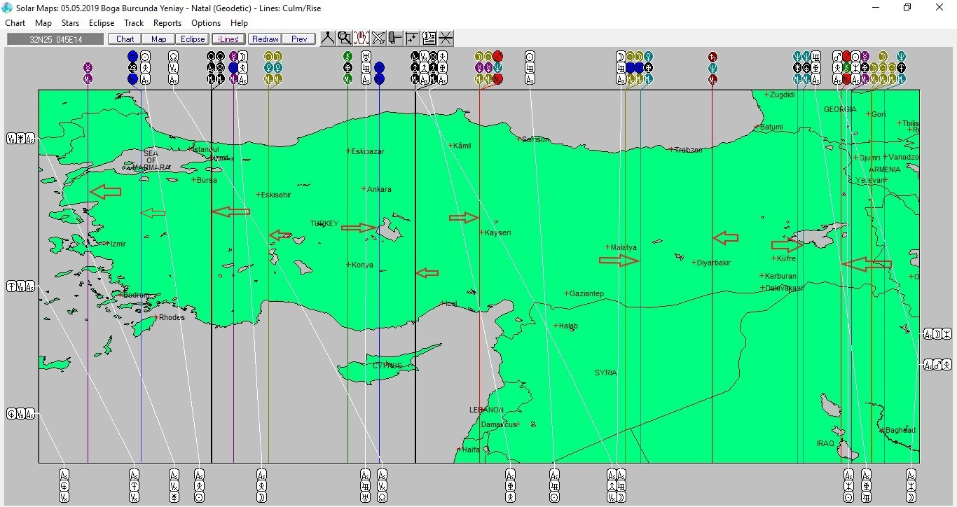 Yukarıda Boğa burcunda gerçekleşecek yeniaya ait ülkemizin kartografik haritasını görmektesiniz. Harita üzerinde renkli hatlar ve çevresi, yeniay enerjisinden daha belirgin etkilenmesi olası yerlerdendir.