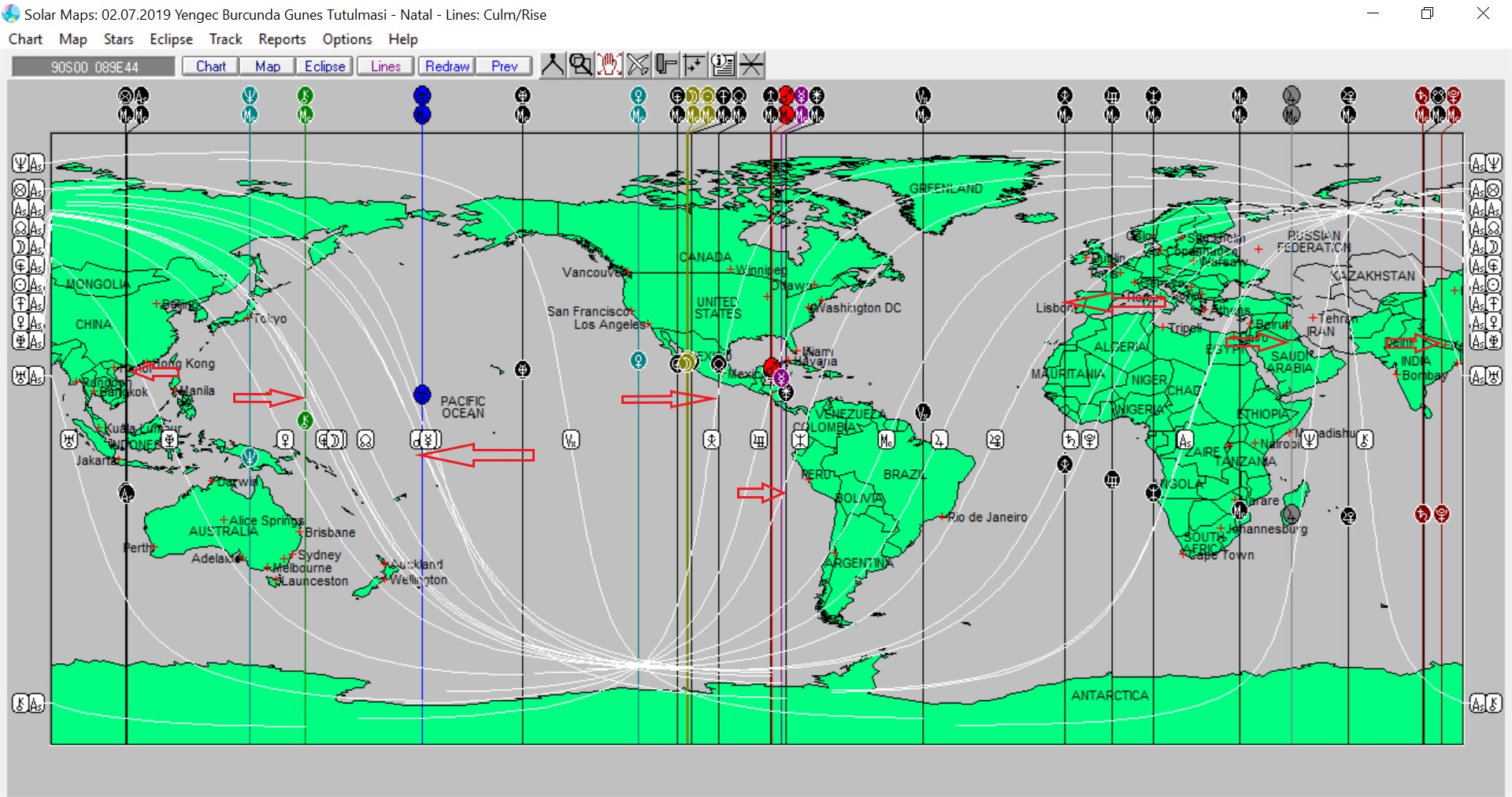 Yukarıda 2 Temmuz günü Yengeç burcunda meydana gelecek olan Güneş tutulmasına ait ülkemizin, aşağıda ise dünya astrokartografik haritalarını görmektesiniz. Harita üzerinde renkli oklarla işaretli hatlar ve çevresi, tutulma enerjisinden daha belirgin etkilenmesi olası yerlerdendir.