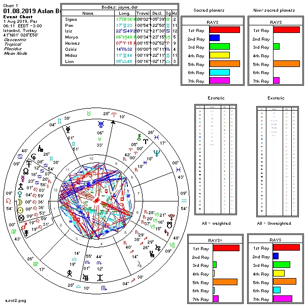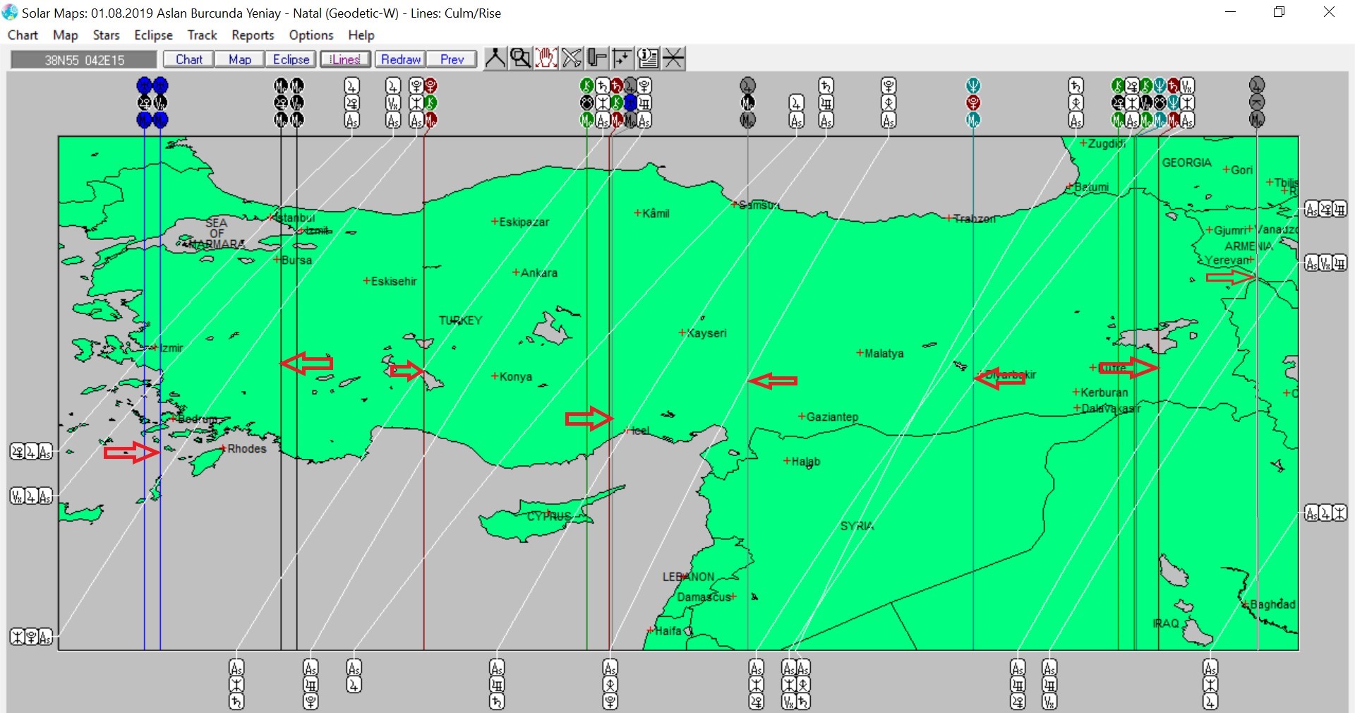 Yukarıda 1 Ağustos günü Aslan burcunda meydana gelecek olan yeniaya ait ülkemizin astrokartografik haritasını görmektesiniz. Harita üzerinde renkli oklarla işaretli hatlar ve çevresi yeniay enerjisinden daha belirgin etkilenmesi olası yerlerdir.