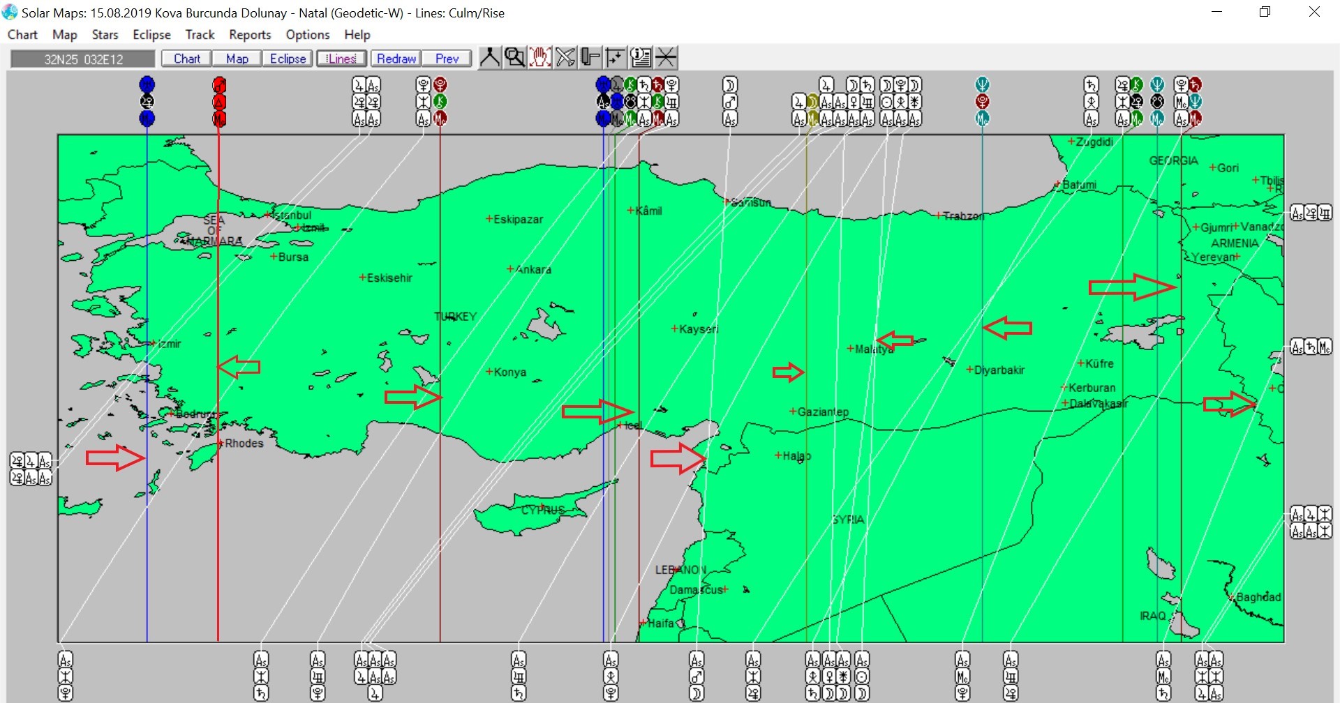 Yukarıda 15 Ağustos’da Kova burcunda meydana gelecek olan dolunaya ait ülkemizin astrokartografik haritasını görmektesiniz. Harita üzerinde renkli oklarla işaretli hatlar ve çevresi yeniay enerjisinden daha belirgin etkilenmesi olası yerlerdir.