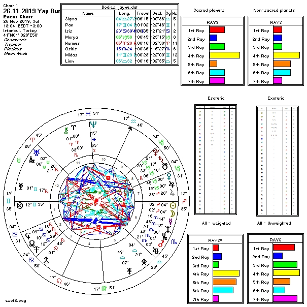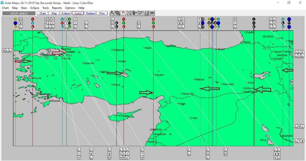 Yukarıda 26 Kasım günü Yay burcunda meydana gelecek yeniaya ait ülkemizin astrokartografik haritasını görmektesiniz. Harita üzerinde renkli oklarla işaretli hatlar ve çevresi yeniay enerjisinden daha belirgin etkilenmesi olası yerlerdendir.