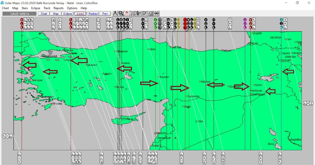 Yukarıda 23 Şubat günü yaşanacak yeniaya ait astrokartografik haritayı görmektesiniz. Harita üzerinde renkli oklarla işaretli hatlar ve çevresi, yeniay enerjisinde daha belirgin etkilenmesi olası yerlerdendir.