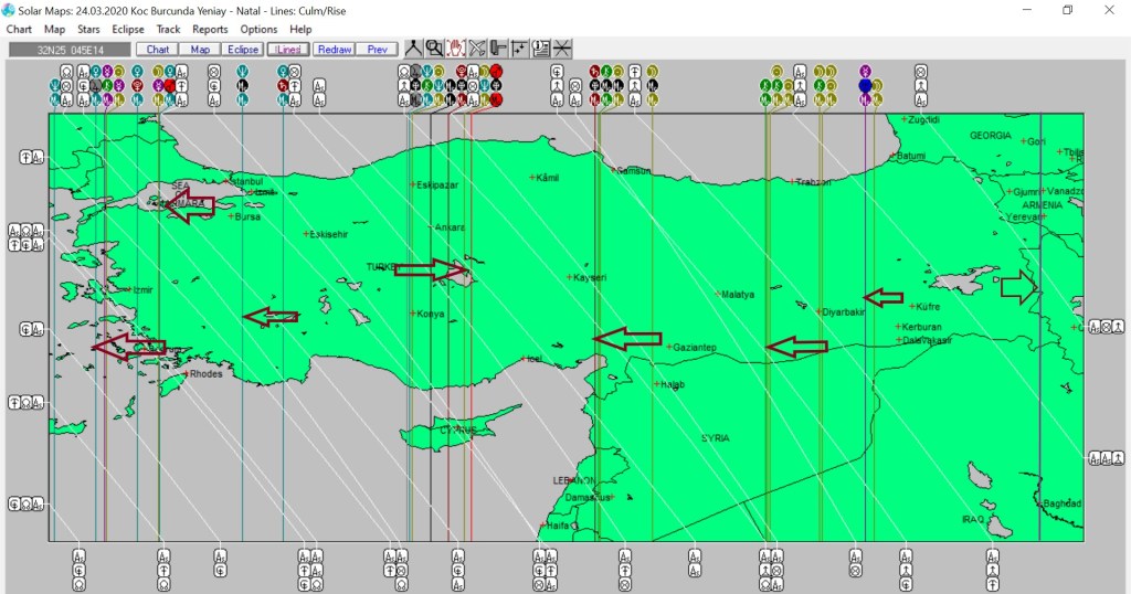 Yukarıda 24 Mart günü yaşanacak olan yeniaya ait astrokartografik haritayı görmektesiniz. Harita üzerinde renkli oklarla işaretli hatlar ve çevresi, yeniay enerjisinden daha belirgin etkilenmesi olası yerlerdendir.