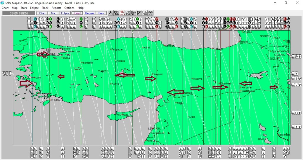 Yukarıda 23 Nisan günü yaşanacak olan yeniaya ait astrokartografik haritayı görmektesiniz. Harita üzerinde renkli oklarla işaretli hatlar ve çevresi, yeniay enerjisinden daha belirgin etkilenmesi olası yerlerdendir.