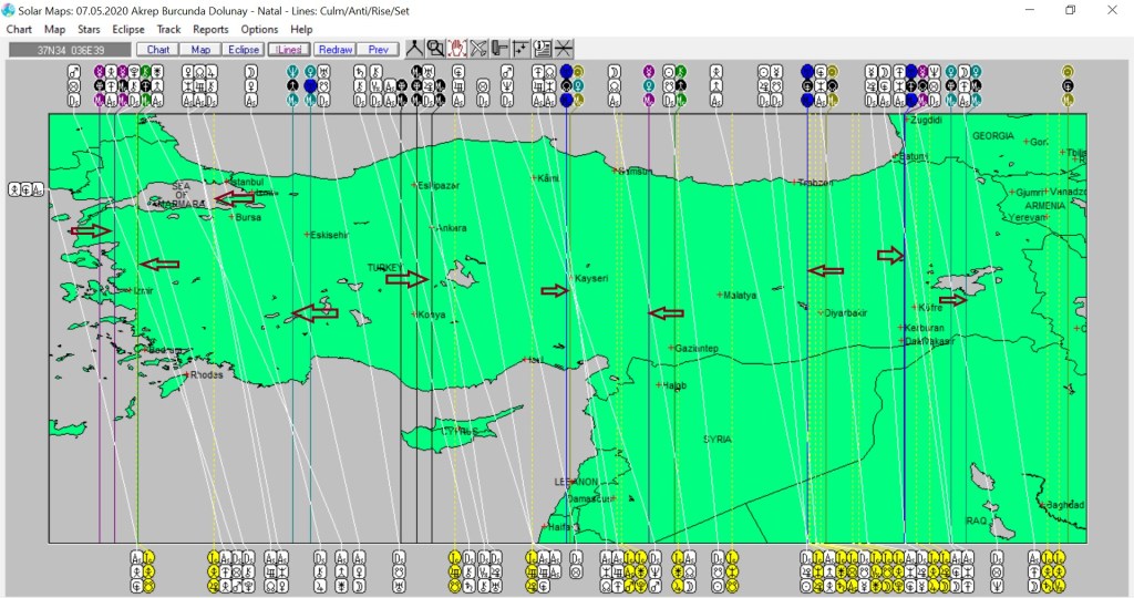 Yukarıda 7 Mayıs günü yaşanacak olan dolunaya ait astrokartografik haritayı görmektesiniz. Harita üzerinde renkli oklarla işaretli hatlar ve çevresi, dolunay enerjisinden daha belirgin etkilenmesi olası yerlerdendir.