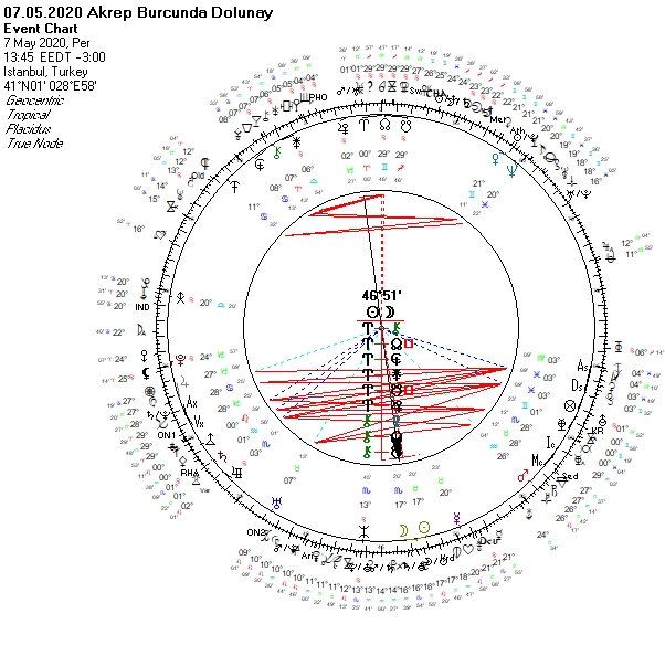 Dolunay sürecinde Güneş Menkar etkileşiminde. Bu sabit yıldız kolektif bilinçaltını, toplum için bir şeyler başarmayı ilgilendiren durumları işaret eder. Dikkat edilmezse şartların kurbanı olunabilir. Ay ise Zubenelgenubi ve Zuben el Schemali ile beraber. Zuben elgenubi hırsızlık, ihanet, kayıp, suistimal ve talihsizliklerle ilişkilendirilir. Zuben elschemali ise sosyal reformlarla, adaletle, itibarla, zenginlikle yani daha olumlu özelliklerle belirtilir. Yani karşı cins ilişkilerinde, duygularda ve irade konulan noktalarda bu sabit yıldız etkilerini de görebiliriz.