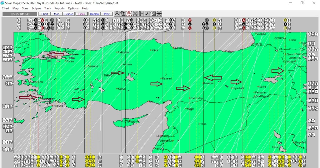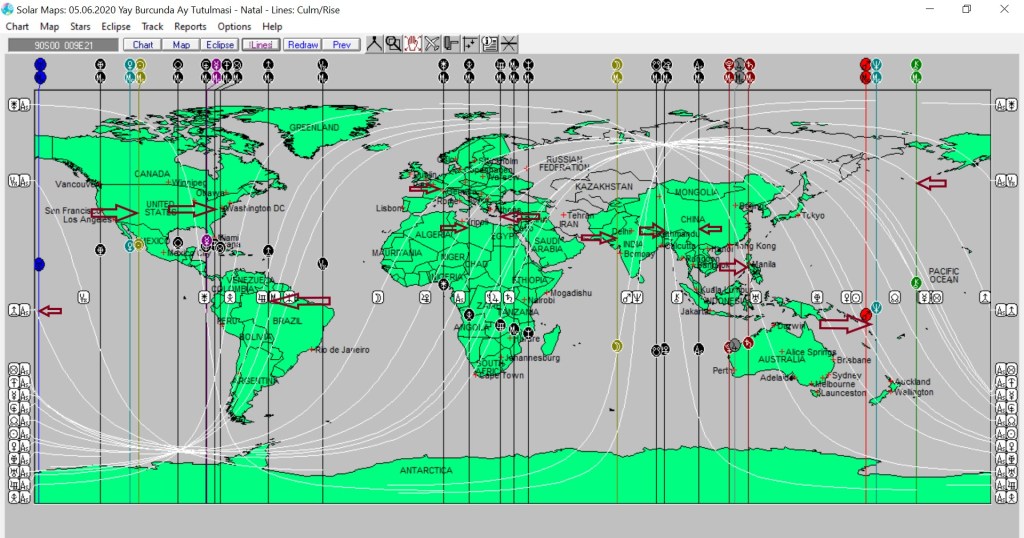 Yukarıda 5 Haziran günü Yay burcunda meydana gelecek Ay tutulmasının ülkemizin, aşağıda ise dünyanın astrokartografik haritalarını görmektesiniz. Haritada renkli oklarla işaretli hatlar ve çevresi, tutulma enerjisinden daha belirgin etkilenmesi olası yerlerdendir.