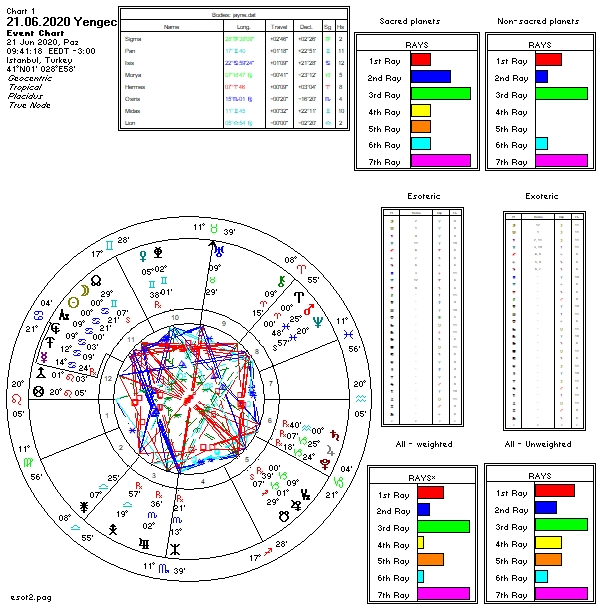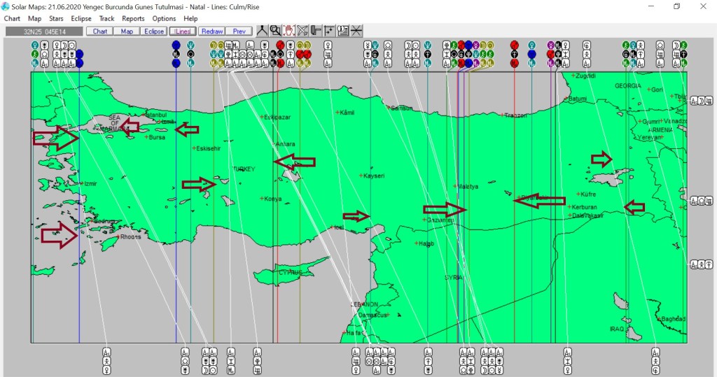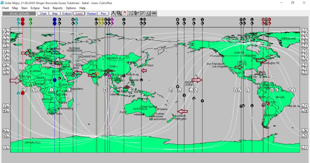 Yukarıda 21 Haziran günü Yengeç burcunda meydana gelecek Güneş tutulmasına ait ülkemizin, aşağıda ise dünyanın astrokartografik haritalarını görmektesiniz. Haritalar üzerinde renkli oklarla işaretli hatlar ve çevresi, tutulma enerjilerinden daha belirgin etkilenmesi olası yerlerdendir.
