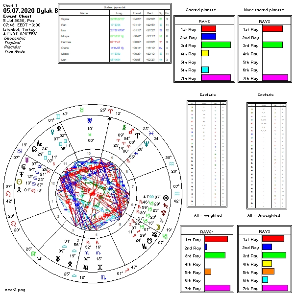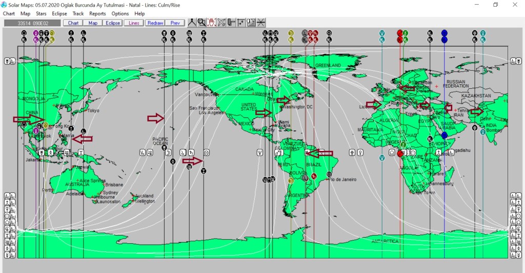 Yukarıda 5 Temmuz günü Oğlak burcunda meydana gelecek Ay tutulmasına ait ülkemizin, aşağıda ise dünyanın astrokartografik haritalarını görmektesiniz. Haritalar üzerinde renkli oklarla işaretli hatlar ve çevresi, tutulma enerjilerinden daha belirgin etkilenmesi olası yerlerdendir.