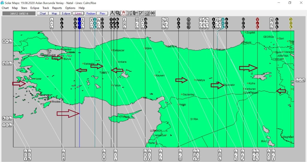 Yukarıda 19 Ağustos günü Aslan burcunda meydana gelecek olan yeniaya ait ülkemizin astrokartografik hatlarını görmektesiniz. Harita üzerinde renkli oklarla işaretli hatlar ve çevresi, yeniay enerjisinden daha belirgin etkilenmesi olası yerlerdendir.