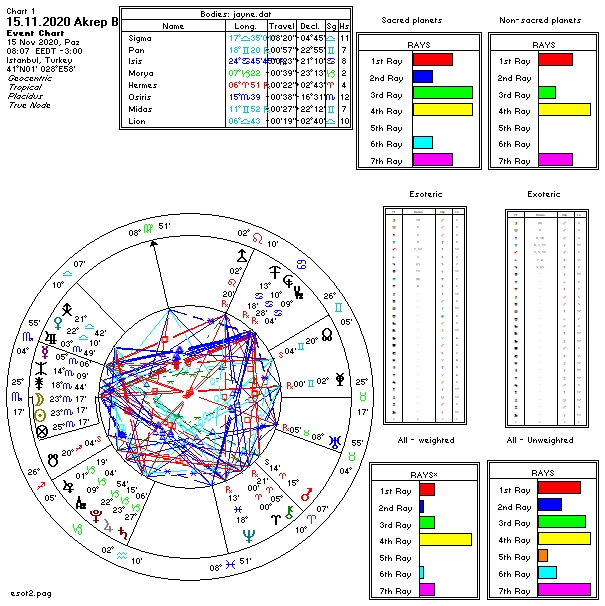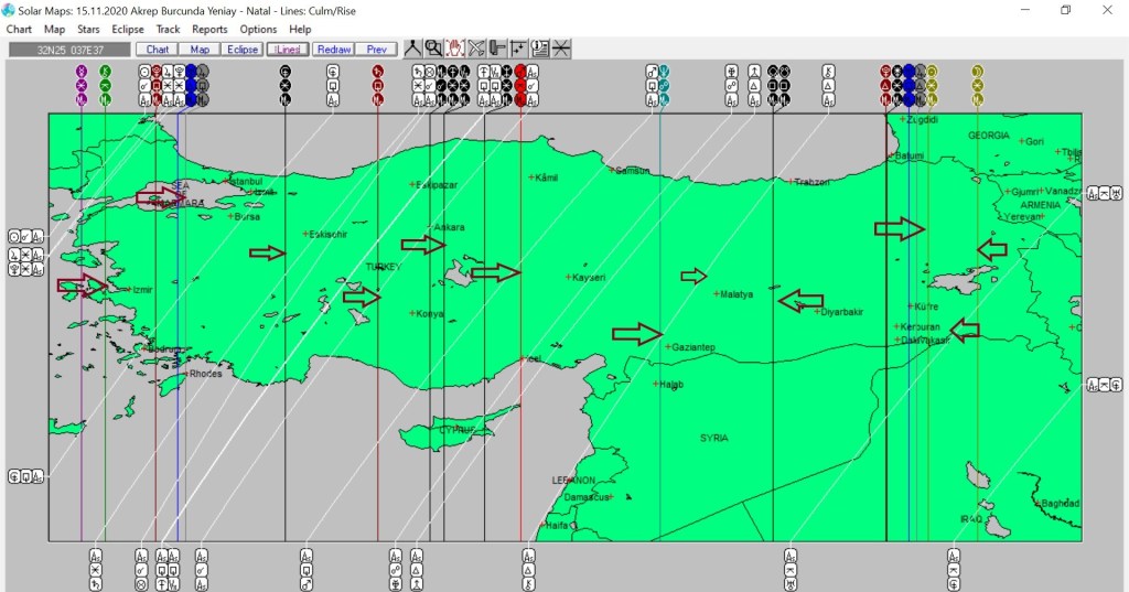 Yukarıda  15 Kasım günü Akrep burcunda meydana gelecek olan yeniaya ait ülkemizin astrokartografik haritasını görmektesiniz. Harita üzerinde renkli oklarla işaretli hatlar ve çevresi, yeniay enerjisinden daha belirgin etkilenmesi olası yerlerdendir.