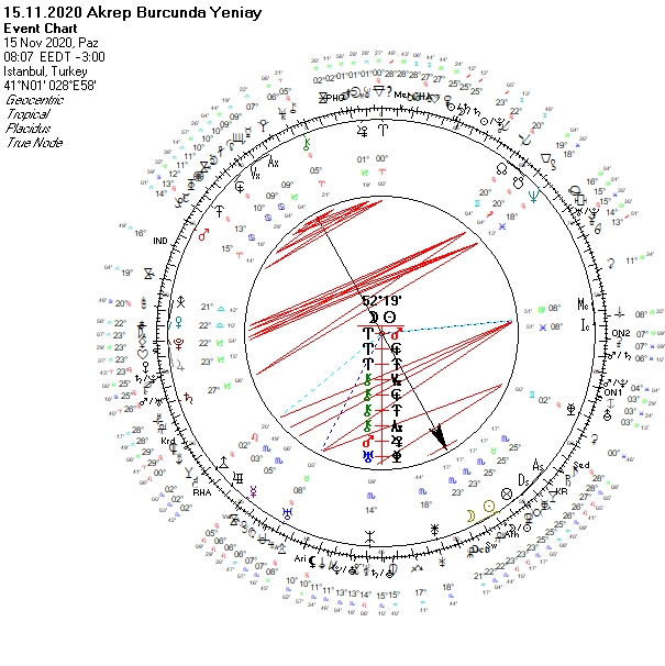 15 Kasım’da Akrep burcunda meydana gelecek yeniayda İstanbul’a göre çıkarttığımız haritaya göre başta şartları yürütmek kolay gibi durmasa da kendinizi ilgilendiren her konu örneğin sağlık, fiziksel durumunuz, dışa takındığınız tavrı etkileyecek gelişmeler, en yakınlarla ilgili durumlar ve başlangıçlar ana konu başlıkları olarak görülmekte. Batıdan doğuya doğru gittiğimizde ise şartlar biraz daha kapalı, kontrol problemi yaratabilecek gibi durmakta. Kayıplar, zorluklar, fedakarlıklar, gizli konular, bilinçaltını etkileyen durumlar, hastane, hapishane gibi kapalı yerlerle ilgili gelişmeler, bağımlılıklar söz konusu olabilir.