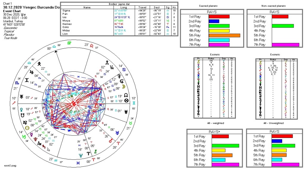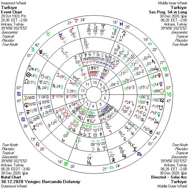 Ülkemiz Pluto’su üzerinde gerçekleşen Yengeç dolunayı aynı zamanda Mars ile de zorlu görünüm oluşturmakta. Diplomaside, ülkeler arası ilişkilerimizde kırılganlıklara vurgu yapmakta. Uluslararası davalar, anlaşmalar, yaptırımlar ve ekonomik yansımaları gündemi belirleyebilir. Venüs ve Neptün’ün açısı şartları çok dikkatli ele almayı, aldatmaları, aldanmaları, durumun görüldüğü, gösterildiği gibi olmayabileceğine dikkat çekmekte. Ardında ülke içi huzura etki edebilecek gelişmeler olabilir. Tempo artabililir. Orduyu, güvenliğimizi ilgilendiren gelişmeler olasıdır. Sığınmacılar, komşu ülkelerle ilgili gelişmeler konu olabilir. Bu noktada gizli düşmanlıkların, planların çalışabileceğine ve şartları ivmelendirici olabileceğine dikkat etmek lazım. Sendikalar, çalışanların hakları, maaş, grevle ilgili gelişmeler gündem yaratabilir. Uluslararası ilişkilerdeki gelişmeler süregelen şartları ekonomik olarak farklı bir şekle döndürebilir. Bu durum borçluluğumuzu, yapılandırılmasını, geri planındaki görüşmeleri, tasarıları işaret edebilir. Topraklarımızı, madenlerimizi, doğal kaynaklarımızı ilgilendiren adımlar atılabilir. Çiftçiler ve inşaat sektörüne yönelik düzenlemeler gelebilir. Nato ve AB ilişkileri dikkati çekebilir. Güneş’in Facies kavuşumu tanınmış kişilerle ilgili şiddeti, kurban olmayı işaret eden durumlara sebep verebilir. Meclis içinde hareketlilik, değişimler hızlanabilir. Belediyeler, yerel yönetimler ve yöneticileri, partiler ve yöneticileri ile ilgili gelişmeler yaşanabilir. Operasyonlar görülebilir. Tutukluluklarla ilgili gelişmeler yaşanabilir. Yeni düzenlemelerin, vergilerin, fiyatlandırmaların hem halka hem de finansal piyasalara, bankalara etkisi dikkati çekebilir. Satürn, Jüpiter ve Uranüs açılarının daralmaya başladığı bu dönem irili ufaklı depremleri görmeye devam edebiliriz.