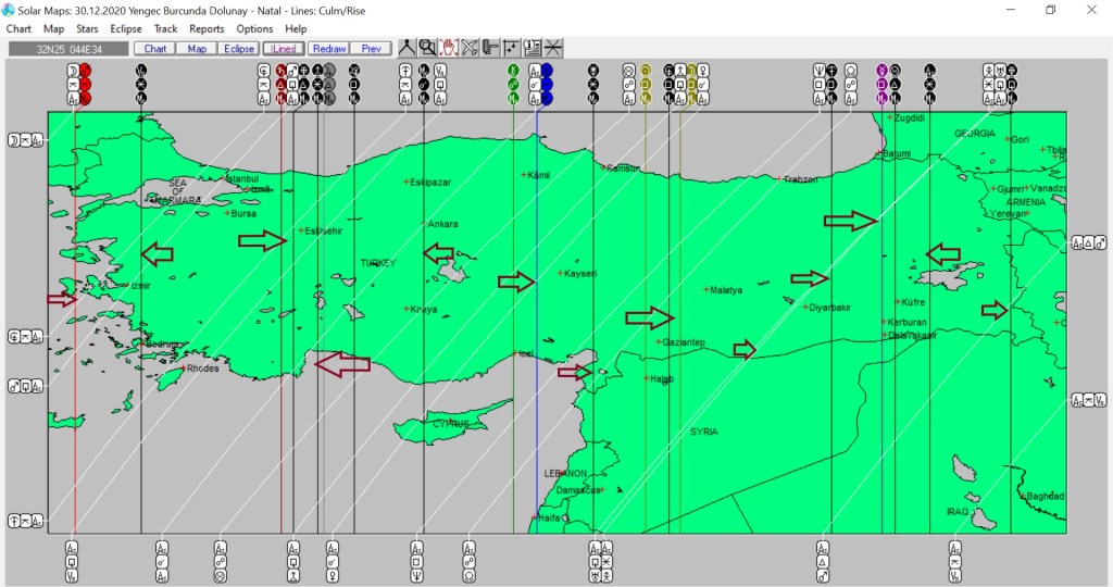 Yukarıda Yengeç dolunayına ait ülkemizin astrokartografik haritasını görmektesiniz. Harita üzerinde renkli oklarla işaretli hatlar ve çevresi, dolunay enerjisinden daha belirgin etkilenmesi olası yerlerdendir.