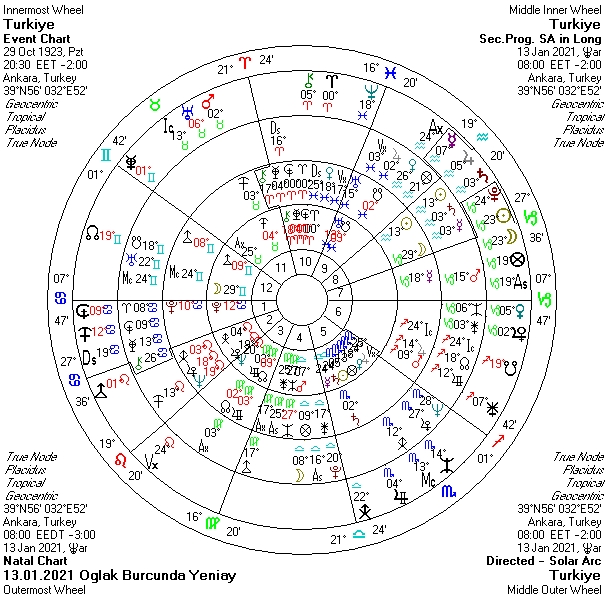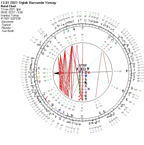 Ülkemiz açısından önemli bir yeniay ile yıla başlıyoruz. Jüpiter – Satürn ikilisinin Mars-Uranüs ikilisine yaptığı sert görünüm, Güneş’imizin karşısında yer alırken ne yazık ki nahoş olayları düşündürtüyor. Önemli bir figüre suikast, saldırı söz konusu olabilir. Düşmanlıklara, sertliklere açık bir süreç. Yani güvenlik konularına dikkat edilmesini işaret eden bir yeniay. Meclis, milletvekilleri, muhalefet yöneticileri, belediyeler, belediye başkanları, konumunda önemli isimler ile ilgili gelişmeler gündemi değiştirebilir. Silah anlaşmaları, savunma sanayine yönelik konular , Nato, AB gibi uluslararası kuruluşlarla ilişkiler zorlayabilir. Kamuya ait yatırımların durumu dikkati çekebilir. Uluslararası davalar, para konuları gündemde kalırken, atılan adımlarla denge yakalanmaya çalışılabilir. Operasyonlar devam edebilir. Gelişmeler diplomatlarımızın, tanınmış önemli kişilerin yanı sıra öğrencileri, eğitim sistemini, gençleri, çocukları ilgilendirebilir. Dünya genelinde agresyonun ivmelendiğini, ayaklanmaların, sertliklerin görüldüğü bir sürece doğru ilerleniyor. Kıbrıs, Mısır, Libya, Doğu Akdeniz ile ilgili gelişmeler gündemi etkileyebilir. Sudan ile ilgili beklenmedik gelişmeler olasıdır. Doğal gaz ve petrol arama çalışmalarını ilgilendiren destekleyici adımlar atılabilir. Uçak kazaları olasıdır. Borsada, para piyasalarında ani hareketler görülebilir. Maliye, bankalar, finans piyasaları, halkın alım gücü zorlanmaya devam ederken, spekülatif yatırım araçlarına yönelik yeni düzenlemeler gelebilir. Kalkınma planlarında, hedeflerde değişime gidilebilir. Deprem yaşanabilir.