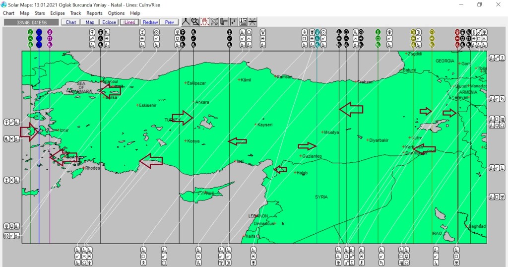 Yukarıda Oğlak yeniayına ait ülkemizin astrokartografik haritasını görmektesiniz. Harita üzerinde oklarla işaretli hatlar ve çevresi, yeniay enerjisinden daha belirgin etkilenmesi olası yerlerdendir.