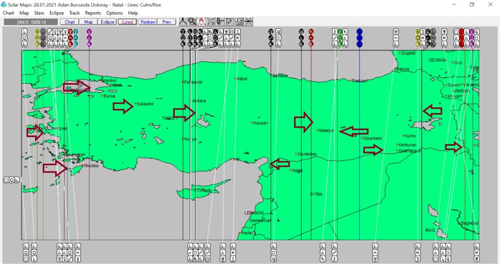 Yukarıda Aslan dolunayına ait ülkemizin astrokartografik haritasını görmektesiniz. Harita üzerinde işaretli hatlar ve çevresi, dolunay enerjisinden daha belirgin etkilenmesi olası yerlerdendir.