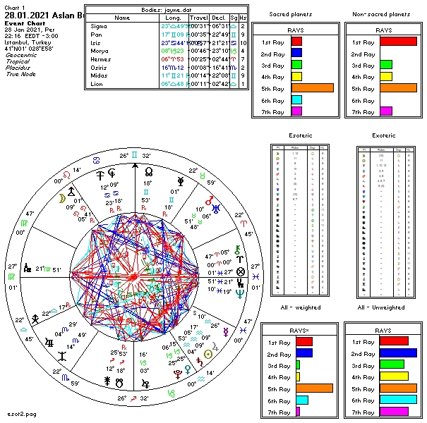 Ay, Asellus Austrails ve Giansar etkileşiminde. Bu yıldızlar askeri tercihleri, özellikle kadında şiddete meyili, keskin ve analitik bir zekayı, cesareti, el sanatlarına yatkınlığı ve yaratıcılığı işaret eder. Güneş ise Albali kavuşumunda ve bu yıldız bir yandan serveti, kazanımları işaret ederken diğer yandan tehlikeye, zulme dikkati çekmekte.