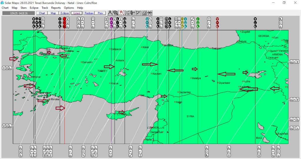 Yukarıda 28 Mart’ta meydana gelecek olan Terazi dolunayına ait ülkemizin astrokartografik haritasını görmektesiniz. Harita üzerinde işaretli hatlar ve çevresi, dolunay enerjisinden daha belirgin etkilenmesi olası yerlerdendir.