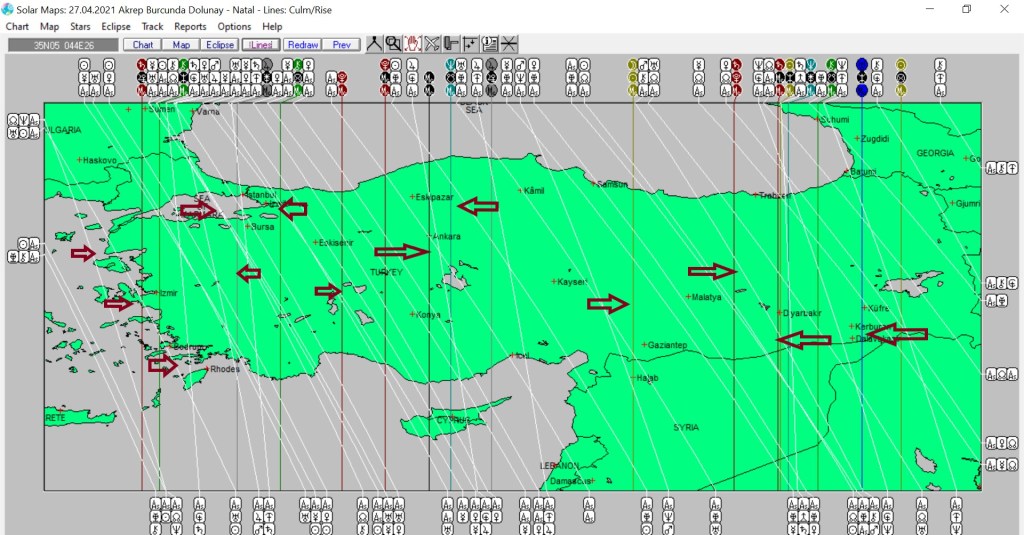 Yukarıda 27 Nisan’da Akrep burcunda meydana gelecek dolunaya ait ülkemizin astrokartografik haritasını görmektesiniz. Harita üzerinde işaretli hatlar ve çevresi, dolunay enerjisinden daha belirgin etkilenmesi olası yerlerdendir.