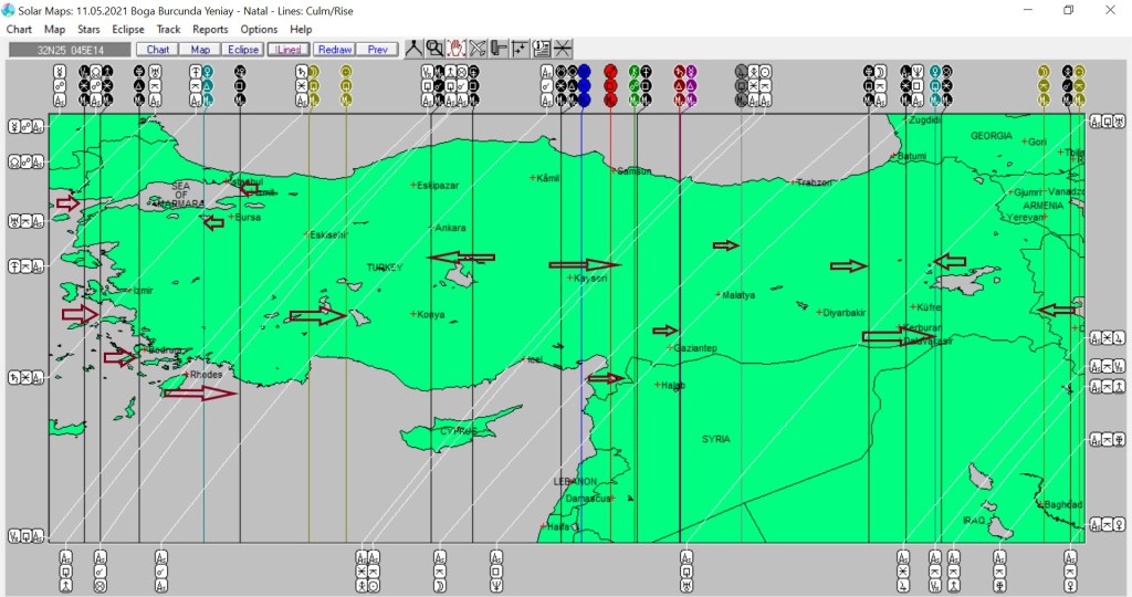 Yukarıda 11 Mayıs’ta Boğa burcunda meydana gelecek yeniaya ait ülkemizin astrokartografik haritasını görmektesiniz. Harita üzerinde işaretli hatlar ve çevresi, yeniay enerjisinden daha belirgin etkilenmesi olası yerlerdendir.