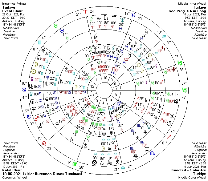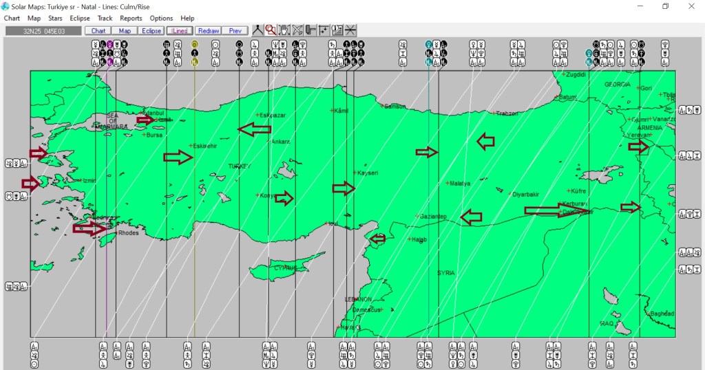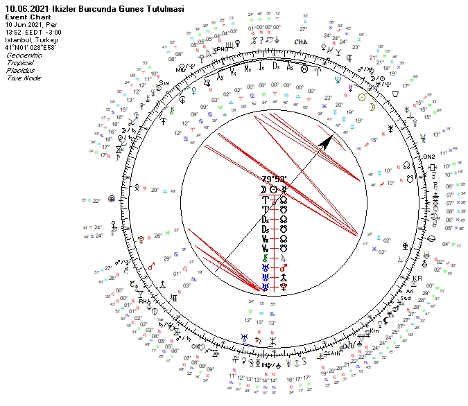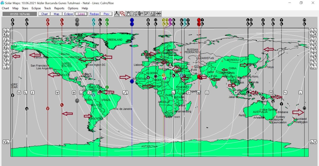 Yukarıda 10 haziran günü yaşanacak olan İkizler burcundaki Güneş tutulmasının dünyaya, aşağıda ise ülkemize ait astrokartografik haritasını görmektesiniz. Harita üzerinde işaretli hatlar ve çevresi, tutulma enerjisinden daha belirgin etkilenmesi olası yerlerdendir.