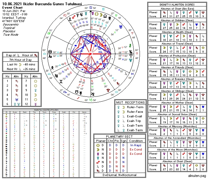 10 haziran günü saat 13:52 de İkizler burcunun 19°47′ derecesinde halkalı Güneş tutulması meydana gelecek. Halkalı tutulmalarda Ay, Güneş’in önünden geçerken Güneş’i tam örtmez ve açıkta kalan Güneş diski yerden bakışla Ay’ın etrafında halka şeklinde görülür.