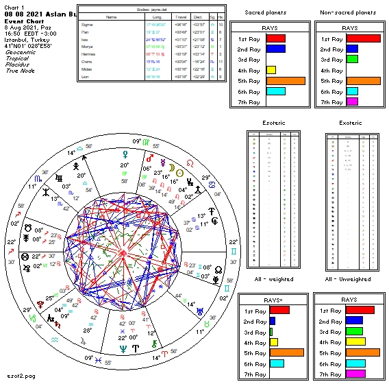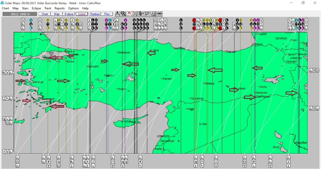 Yukarıda 8 Ağustos Aslan yeniayına ait astrokartografik haritayı görmektesiniz. Harita üzerinde işaretli hatlar ve çevresi, yeniay enerjisinden belirgin etkilenmesi olası yerlerdendir.