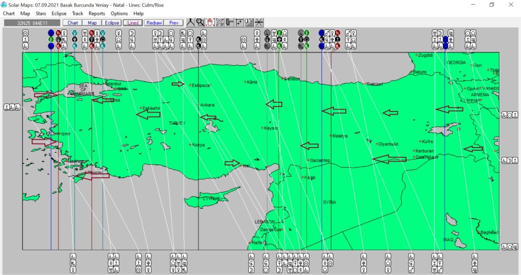 Yukarıda 7 Eylül günü Başak burcunda meydana gelecek yeniaya ait astrokartografik haritayı görmektesiniz. Harita üzerinde işaretli hatlar ve çevresi, yeniay enerjisinden belirgin etkilenmesi olası yerlerdendir.