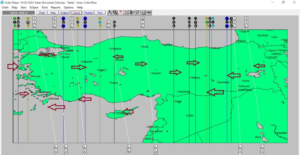 Yukarıda Aslan dolunayına ait ülkemizin astrokartografik haritasını görmektesiniz. Harita üzerinde işaretli hatlar ve çevresi, dolunay enerjisinden daha belirgin etkilenmesi olası yerlerdendir.