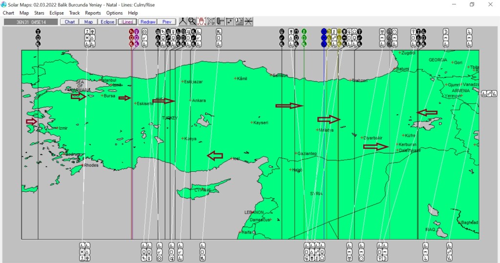 Yukarıda 2 Mart günü Balık burcunda meydana gelecek olan yeniayın astrokartografik haritasını görmektesiniz. Harita üzerinde işaretli hatlar ve çevresi, yeniay enerjisinden daha belirgin etkilenmesi olası yerlerdendir.