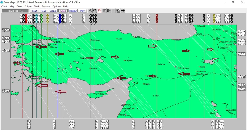 Yukarıda 18 Mart günü Başak burcunda yaşanacak dolunayın astrokartografik haritasını görmektesiniz. Harita üzerinde işaretli hatlar ve çevresi, dolunay enerjisinden belirgin etkilenmesi olası yerlerdendir.
