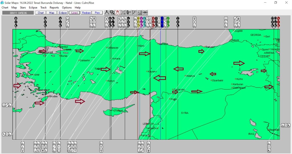 Yukarıda 16 Nisan günü Terazi burcunda meydana gelecek olan dolunayın astrokartografik haritasını görmektesiniz. Harita üzerinde işaretli hatlar ve çevresi, dolunay enerjisinden belirgin etkilenmesi olası yerlerdir.