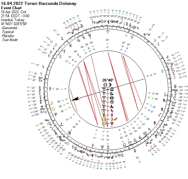 16 Nisan günü saat 21:54 de Terazi burcunun 26°45’ derecesinde bir dolunay meydana gelecek. Dolunaya ev sahipliği yapacak olan Terazi burcu adalet, diplomasi, politika, nezaket, genç kadınlar ve sanatla ilgilidir. Gölgesinde kararsızlık yaşamak, uzlaşıyı, dengeyi ararken denge kaybı, yüzeysellik ve güvensizlik vardır. Siyasetçiler, diplomatlar, hukukçular, sanatçılar, mimarlar, dekoratörler, peyzaj mimarları, mobilyacılar, perdeciler, çiçekçiler, kuaförler, makyözler, güzellik salonları, modacılar, şarap, tekstil sektörü, halkla ilişkiler Terazi burcuyla anılır. Dolayısıyla dolunay sürecinde Terazi özellikleri ile birlikte, bu gruplara ait gelişmeleri de daha belirgin gözlemleyebiliriz.