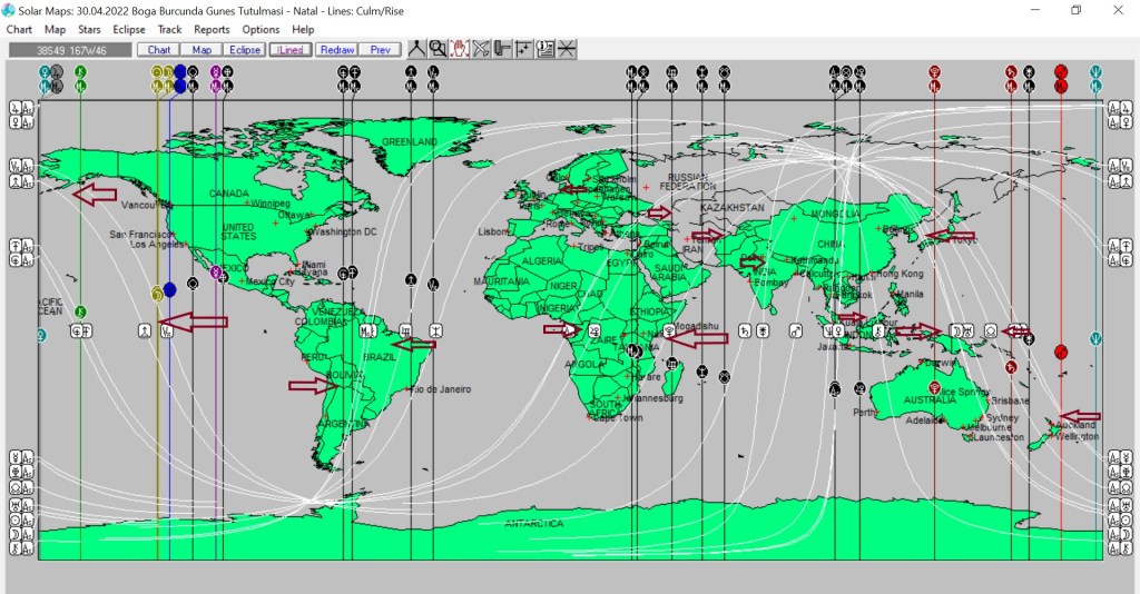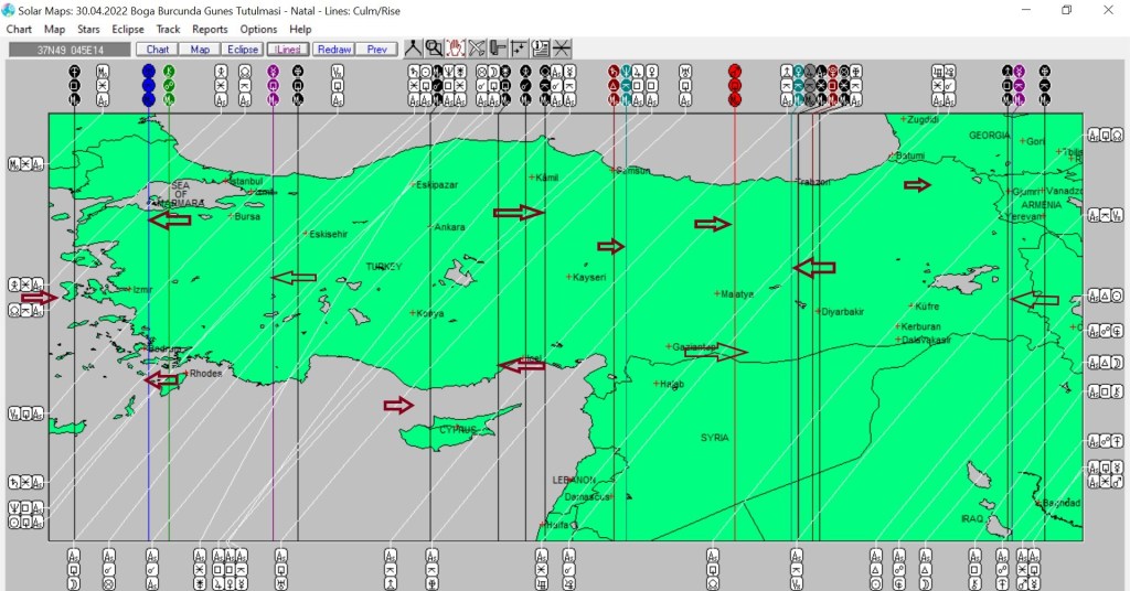 Yukarıda Boğa burcundaki Güneş tutulmasının dünyaya, aşağıda ise ülkemize ait astrokartografik haritalarını görmektesiniz. Harita üzerinde işaretli hatlar ve çevresi, tutulma enerjisinden belirgin etkilenmesi olası yerlerdendir.